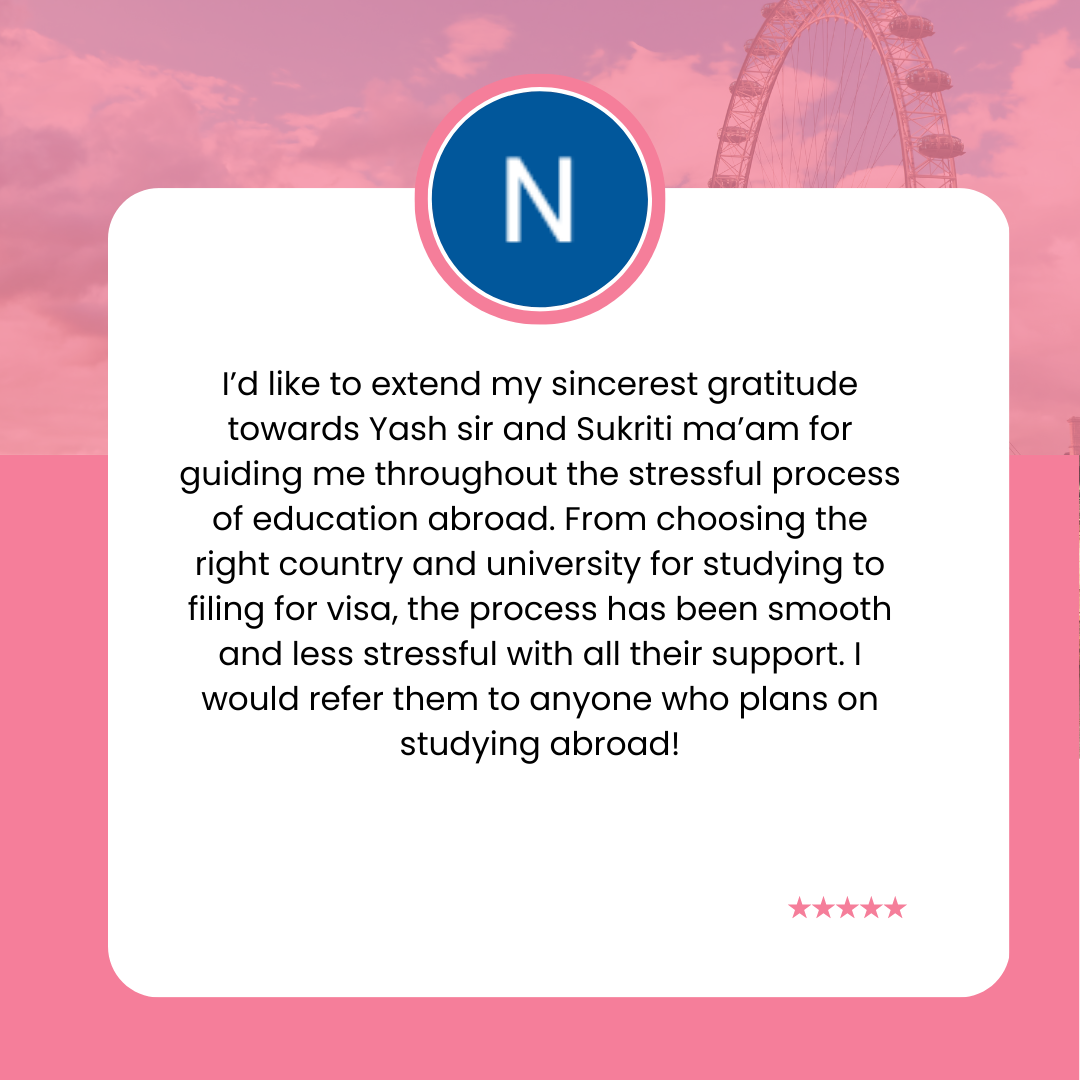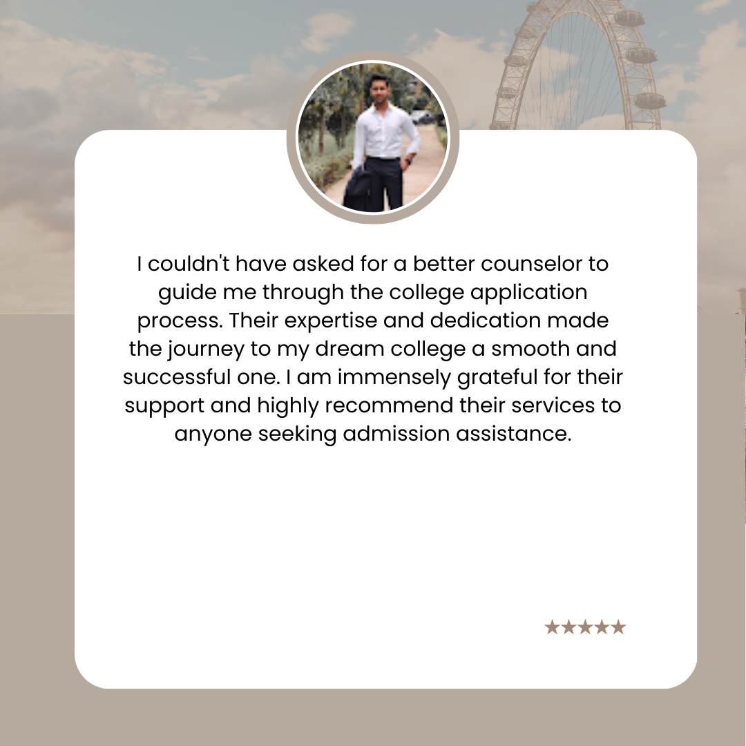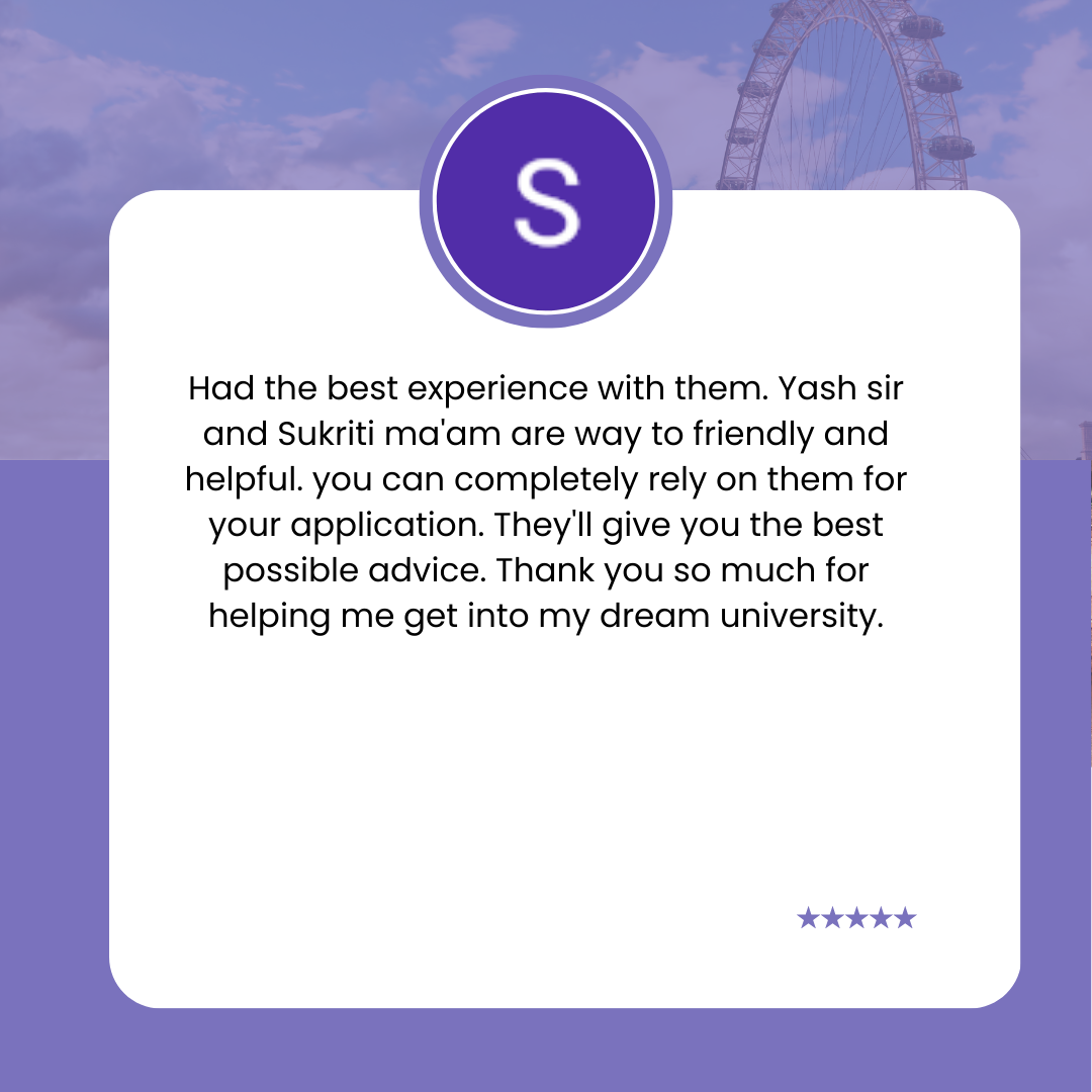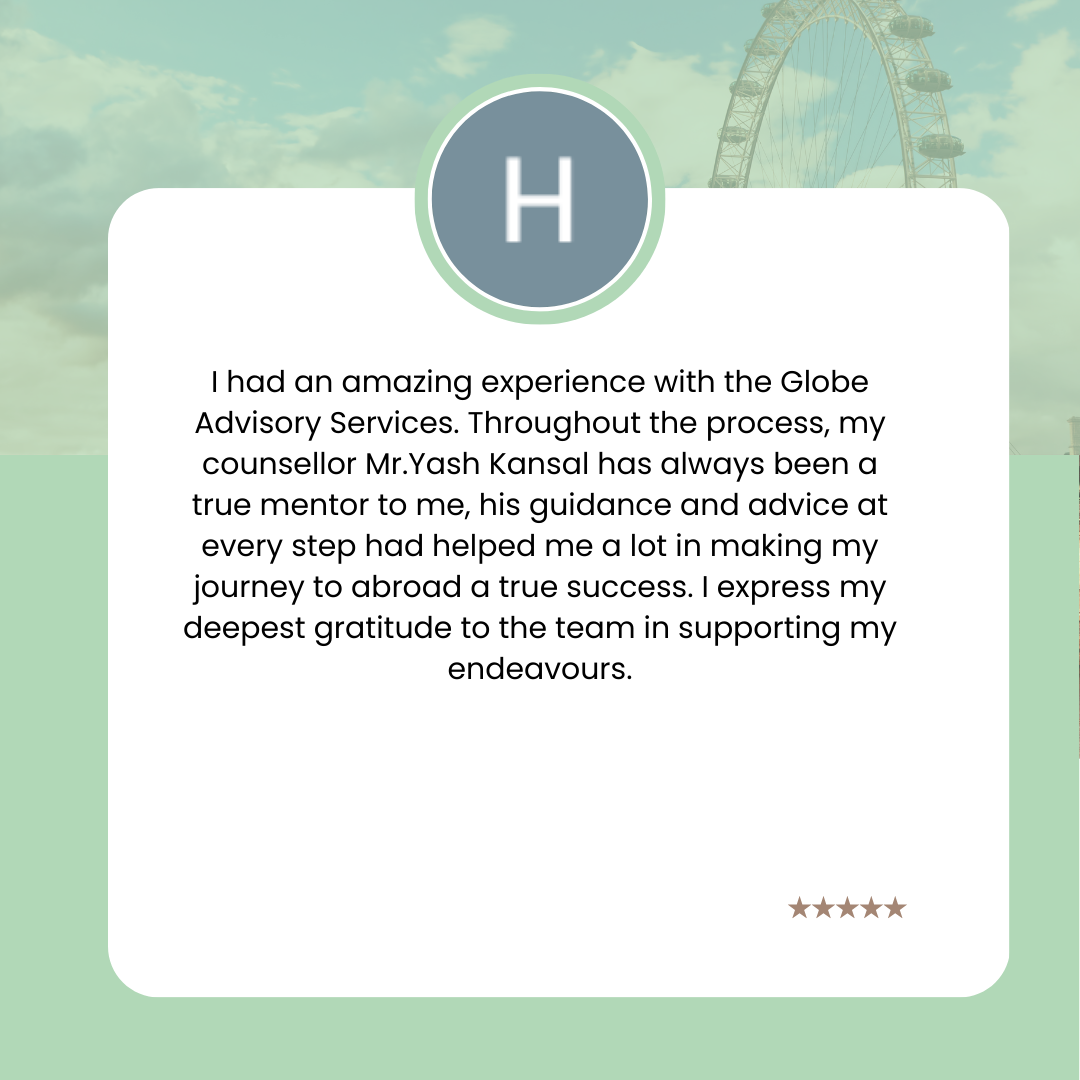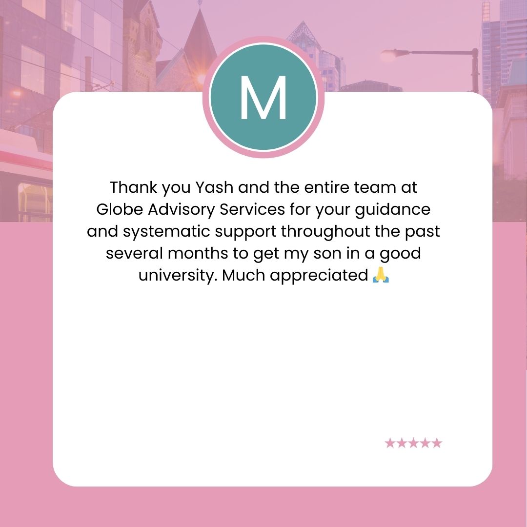 Thank you Yash and the entire team at Globe Advisory Services for your guidance and systematic support throughout the past several months to get my son in a good university. Much appreciated 🙏