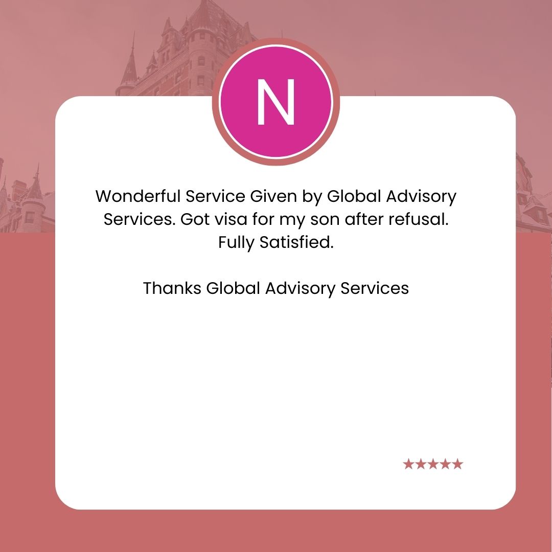 Wonderful Service Given by Global Advisory Services. Got visa for my son after refusel. Fully Satisfied. Thanks Global Advisory Services