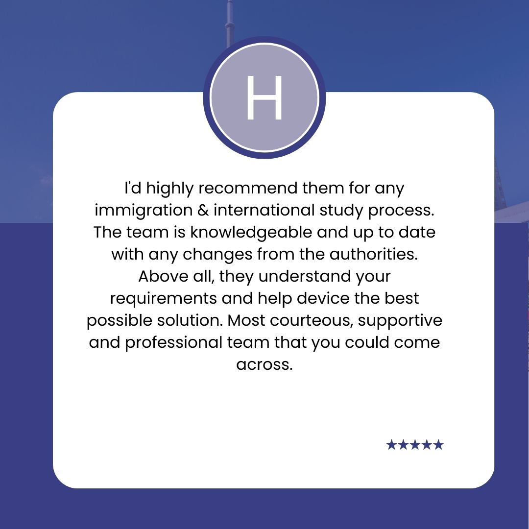 l'd highly recommend them for any immigration & international study process. The team is knowledgeable and up to date with any changes from the authorities. Above all, they understand your requirements and help device the best possible solution. Most courteous, supportive and professional team that you could come across.
